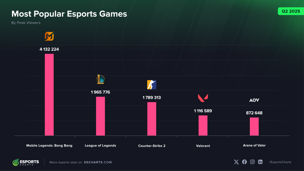 En el segundo trimestre de 2025, MLBB se coronó como el título de esports más popular del mundo, atrayendo a más de 4,1 millones de espectadores simultáneos y superando a gigantes históricos del PC como League of Legends. Este crecimiento sostenido y su relevancia cultural han consolidado a MLBB no solo como un juego líder, sino también como una plataforma global de entretenimiento que continúa impulsando alianzas, colaboraciones e innovación en el sector.